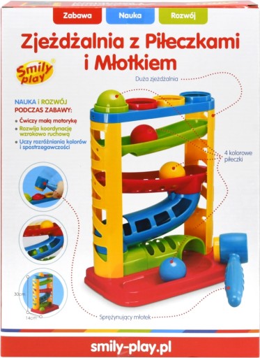 Sensoryczna zjeżdżalnia ma trwałą podstawę, kolory piłek odpowiadają obręczom w górnej części zabawki. Włóż piłeczkę stuknij młotkiem a piłeczki będą zjeżdżać coraz szybciej.