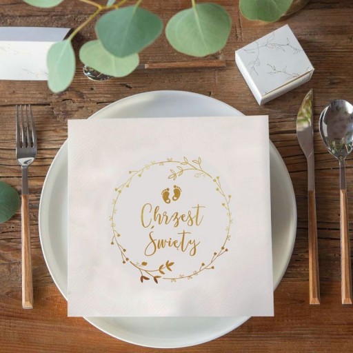 - skład: 20szt serwetek na Chrzest Święty w białym kolorze z motywem rustykalnego wianuszka, stópek i napisem Chrzest Święty