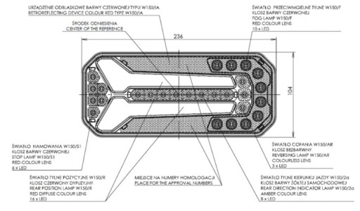 W150 to nowoczesna diodowa lampa zespolona tylna o charakterystycznym kształcie światła pozycyjnego, co czyni ja lampa rozpoznawalna i dobrze widoczna na drodze. Led’owe moduły światła pozycyjnego wykonane są ze specjalnego tworzywa dzięki któremu nie widać poszczególnych punktów świetlnych, a jedynie kształt z przyjemna dla oka świetlna łuna o efekcie neonu. Może pracować w instalacjach 12V jak i 24V, posiada homologacje kompatybilności elektromagnetycznej i stopień ochrony IP 66/68.