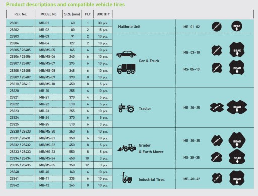 - Wkłady MB służą do naprawy opon diagonalnych, począwszy od samochodów osobowych, aż po maszyny budowlane.