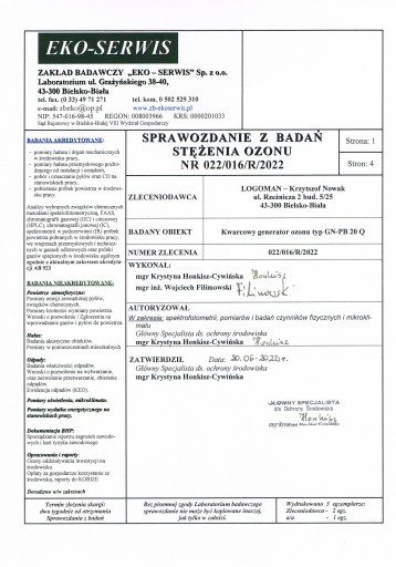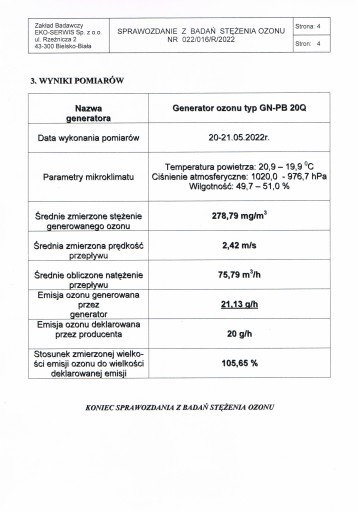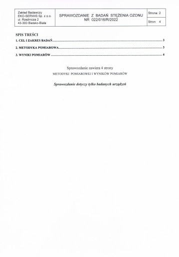 Sprawozdanie z badań stężenia ozonu przez Akredytowany Zakład Badawczy
