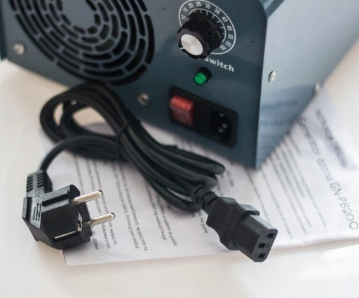 Bezpieczny 3-żyłowy kabel z uziemieniem do obudowy (zwracaj na to uwagę - bezpieczeństwo przede wszystkim). Tanie generatory ozonu mają zwykle dwużyłowe kable nie spełniające norm bezpieczeństwa.