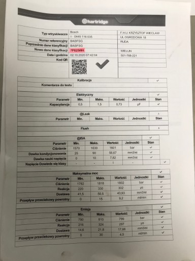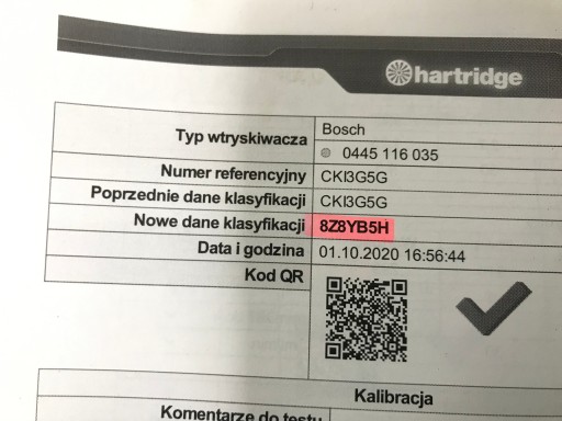 Wtryskiwacz w idelnym stanie nie regenerowany sprawność jest potwierdzona wydrukiem ze stołu probierczego HARTRIDGE na którym został wygenerowany nowy kod klasyfikacji IMA.