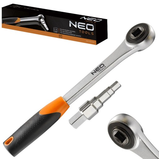 Klucz do śrubunków 1/2" NEO (nr ref. 02-060) wyposażony w grzechotkę przelotową i klucz sztorcowy stopniowany do rozmiarów 3/8", 12 mm, 1/2", 16.8 mm oraz 22 mm. Przeznaczony między innymi do montażu i demontażu łączników z gwintem zewnętrznym, śrubunków. Wykonanie z wysokiej jakości stali chromowo- wanadowej zapewnia długoletnią trwałość klucza. Ergonomiczny, dwumateriałowy uchwyt z tworzywa sztucznego podnosi komfort pracy oraz zapobiega wyślizgiwaniu się klucza z dłoni. Niezawodność produktu potwierdza 25-letnia gwarancja. Marka NEO spełnia oczekiwania profesjonalistów.