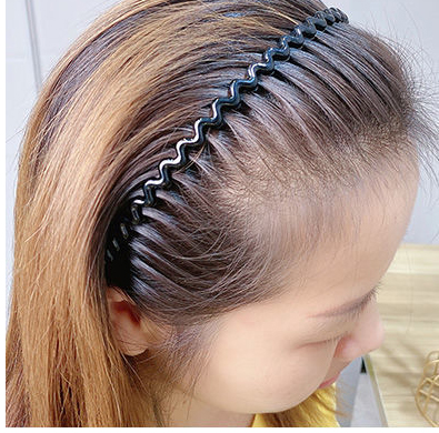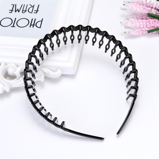 Klasyczna wersja opaski fali w kolorze czarnym lakierowanej na połysk w została wzbogacona gęstymi zębami jak w grzebieniu, co sprawia, że łatwo przeczesać włosy i ułożyć je nie na gładko, tylko z przedziałkami.