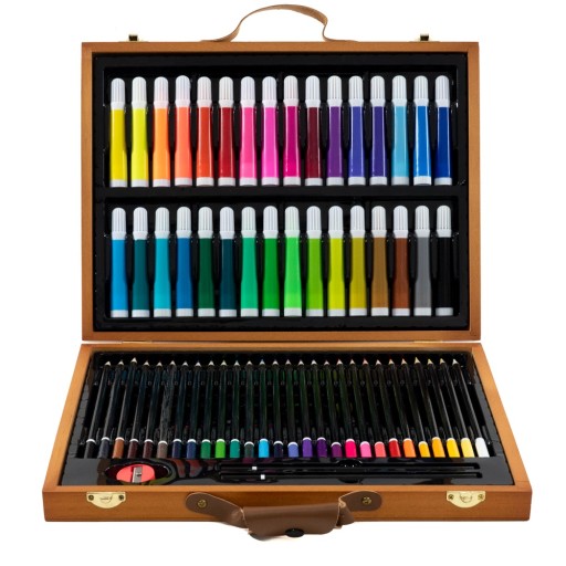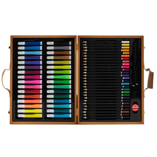 Zestawy artystyczne to szeroki wybór akcesoriów do malowania i rysowania zamknięty w estetycznej walizce do przenoszenia. Komplet składa się z 63 elementów - mnogość przyborów sprawi, że każde użycie zestawu artystycznego będzie doskonałą podróżą w świat sztuki. Wykonane z najwyższej jakości materiałów przybory mają szeroką gamę kolorystyczną, co dodatkowo ułatwi wykonywanie prac plastycznych. Wysokiej jakości akcesoria zawarte w zestawie dobrze kryją papier oraz są bardzo wydajne, dzięki czemu będziesz mógł tworzyć swoje prace przez długi czas.