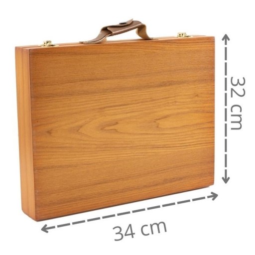 - Zestaw artystyczny zapakowany jest w drewnianej walizce, z wygodnym uchwytem, dodatkowo posiada on małe rozmiary, dzięki czemu możemy go zabrać ze sobą dosłownie wszędzie.