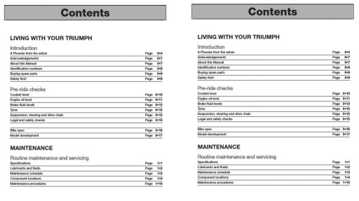 W książce opisano motocykle marki Triumph 1050 Sprint ST, Speed Triple oraz Tiger. Książka zawiera historię modelu, przygotowanie motocykla do jazdy, szczegółowe dane techniczne, informacje o przeglądach okresowych, specyfikacje modelu, praktyczne porady i tricki serwisowe.