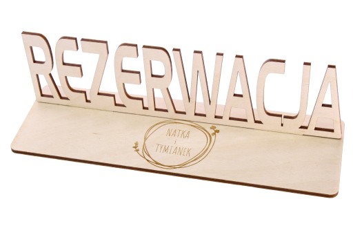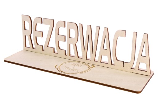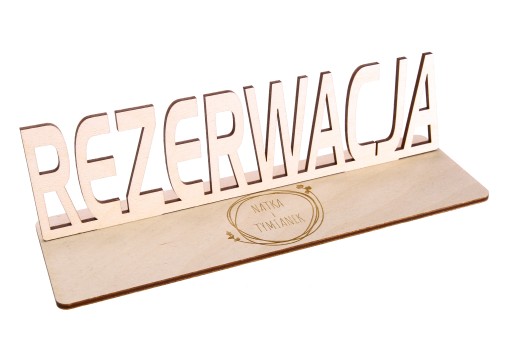 Napis rezerwacja wykonany z drewna z grawerem np. logo na podstawce.