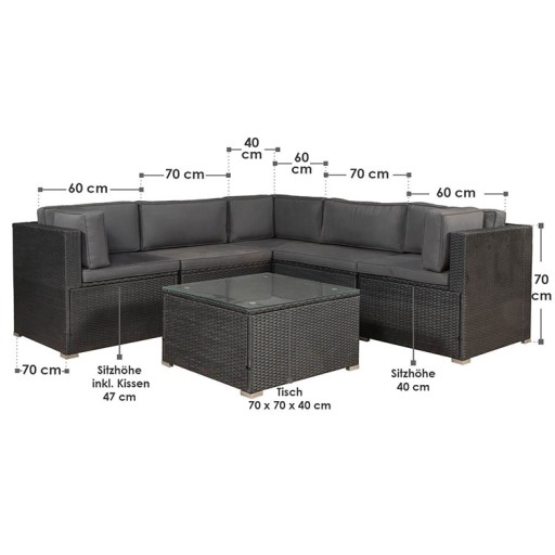 Nawet bez poduszek splot z polirattanu jest niezwykle wygodny. Elastyczne i jednocześnie sprężyste włókna optymalnie dopasowują się do konturów ciała, zapewniając w ten sposób przyjemne uczucie siedzenia. Poduszki siedzisk o grubości 7 cm i oparcia o grubości 20 cm sprawiają, że siedzisko to jest wyjątkowe i miękkie . Dzięki wygodnej wysokości siedziska wynoszącej 47 cm możesz wygodnie odpoczywać podczas długich letnich wieczów.