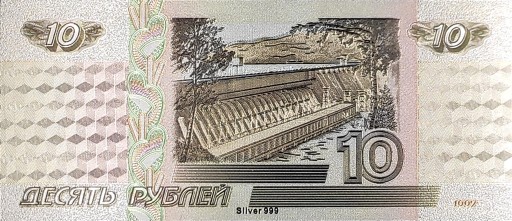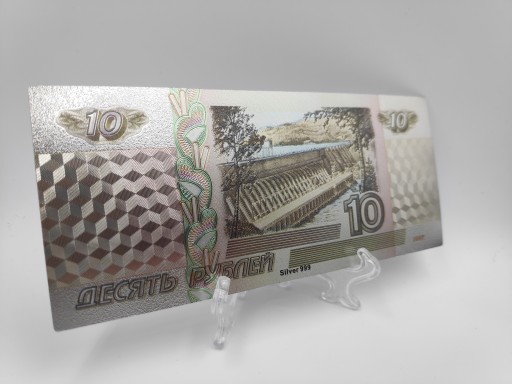 Jest to replika rosyjskiego banknotu o nominale 10 rubli wykonana z PCV i powlekana folią w srebrnym kolorze.