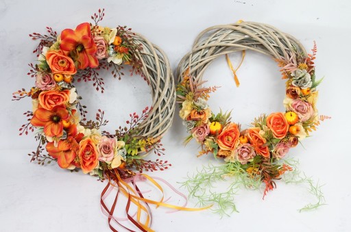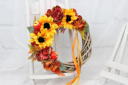 Jesienny wianek wiklinowy o średnicy 25cm udekorowany kwiatami peoni, słonecznika i hortensji.