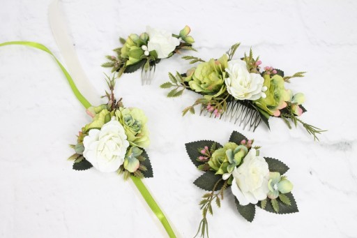 Wykonany z kwiatów róży i hortensji w kolorze zgaszonej zieleni i kremu, zdobiony gałązkami bluszczu, ozdobnej trawy i perełkami.