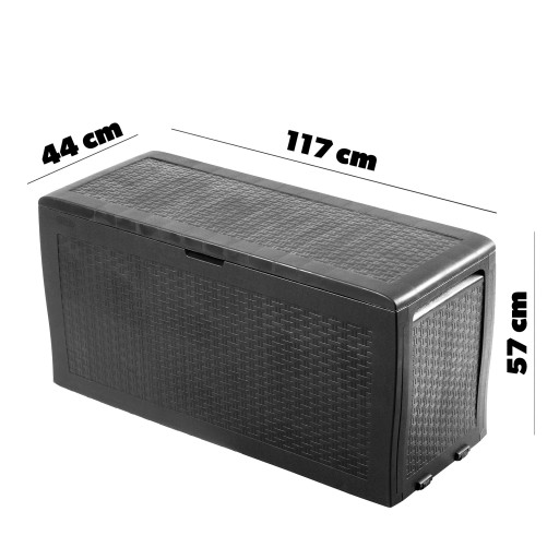 Nasza skrzynia to też łatwy i szybki montaż – bez użycia narzędzi. Produkt nie sprawia żadnych problemów w utrzymaniu czystości. Przedmiot jest trwały, odporny na odbarwienia, wilgoć i brud. Materiał najwyższej jakości jest wytrzymały i zapewnia estetyczny wygląd przez wiele sezonów, nie trzeba go impregnować ani zabezpieczać przed zimą.