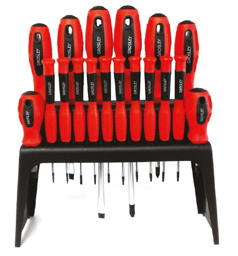 Zestaw śrubokrętów z stojakiem. 18 wkrętaków różnych długości oraz wielkości (krótkie, normalne oraz precyzyjne) w standardzie PHILIPS "krzyżak", SL "płaskie" oraz TORX "gwiazdka".
