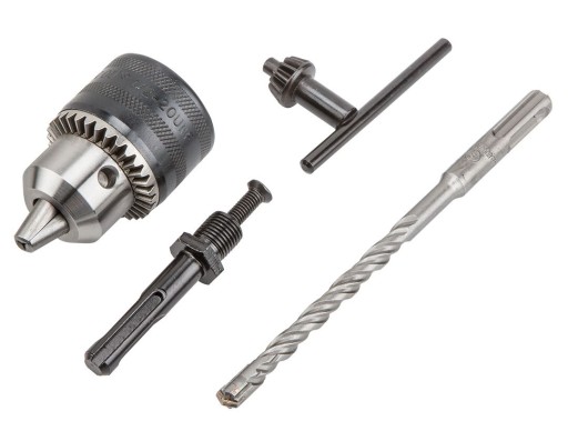 W zestawie z młotowiertarką znajdują się: dodatkowe wiertła, uchwyt wiertarski, adapter do uchwytu, listwa ogranicznika głębokości wiercenia, obrotowa rękojeść dodatkowa, zasobnik ze smarem oraz walizka transportowa. Urządzenie wyposażono w elastyczny i wytrzymały przewód zasilający w powłoce gumowej o długości 3m, dedykowany także do zastosowań profesjonalnych i przemysłowych zarówno wewnątrz jak i na zewnątrz pomieszczeń. Zgodność z europejskimi standardami zapewnia certyfikat CE.