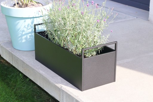 Prezentujemy czarny kwietnik będący funkcjonalną metalową skrzynką na kwiaty z poręcznymi uchwytami do przenoszenia. Donica wykonana została z wytrzymałej, malowanej proszkowo stali.