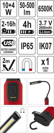Lampa warsztatowa YATO dzięki elastycznemu, cienkiemu ramieniu oraz dwustronnej diodzie COB umożliwia oświetlenie trudno dostępnych miejsc. Dzięki stabilnej, magnetycznej podstawie świetnie sprawdzi się również jako lampka biurkowa. Dodatkowym atutem jest wysoka, maksymalna moc światła 500lm oraz płynna regulacja, która umożliwi dobór oświetlenia do wykonywanej czynności i poziomu naładowania baterii. Lampa wyposażona jest w litowo-jonowy akumulator o pojemności 2600mAh, który zapewni pracę nawet do 16h. Wyjątkową odporność na wodę, pył oraz upadki gwarantuje klasa szczelności IP65 oraz klasa ochrony mechanicznej IK07