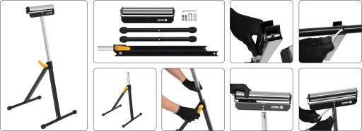 Metalowa podpora z rolką (wałkiem) transportową do podtrzymywania długich elementów podczas obróbki, np. przy stole pilarki lub frezarki. Dopuszczalne obciążenie ok. 60 kg. Wysokość podpory regulowana w zakresie od 68 do 105 cm, szerokość rolki 29 cm. Nogi wykonane z ocynkowanej i lakierowanej blachy stalowej, profil 30 x 30 mm.