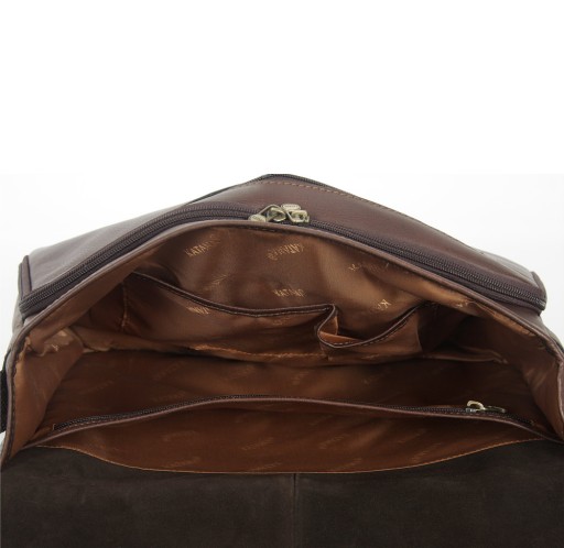 Torba zamykana dużą klapą na patkę z magnesem. Obszerna komora główna zawiera naszyte kieszonki na telefony. Karty kredytowe i długopisy umieścimy w odrębnej przegrodzie w specjalnych kieszonkach. Mnogość przegród i kieszeni to możliwość swobodnej segregacji zawartości i utrzymania porządku. Nieodzownym elementem takiej torby jest długi, solidny pasek do noszenia na ramieniu. Wykonany z mocnej taśmy nośnej obszytej skórą, łączy w sobie elegancję i wytrzymałość. Szerokość paska 3,3 cm. Wnętrze wykończone bardzo trwałą, żakardową podszewką firmy KATANA.