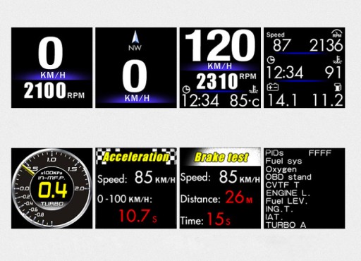 Prosta funkcja: prędkość; wielofunkcyjny; 6 rodzajów informacji; ciśnienie turbo (Uwaga: jeśli samochód nie ma turbo, to nie ma danych); Test przyspieszenia (czas od 0,0 mil/h do 62,1 mil/h); test hamulców (Czas po zatrzymaniu hamulca do samochodu); przepływ danych