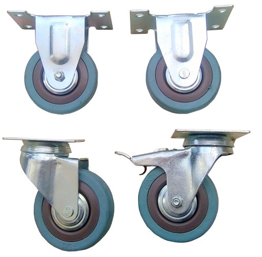 Koła mocowane na tzw. płytkę są połączeniem widelca aparaturowego wykonanego z tłoczonej blachy stalowej oraz koła z piastą polipropylenową i oponką z szarej niebrudzącej gumy. Głowica skrętna widelca jest podwójnie ułożyskowana. Wszystkie elementy metalowe zestawu pokryte są antykorozyjną powłoką chromowo-cynkową. Hamulec blokuje koło i głowicę.