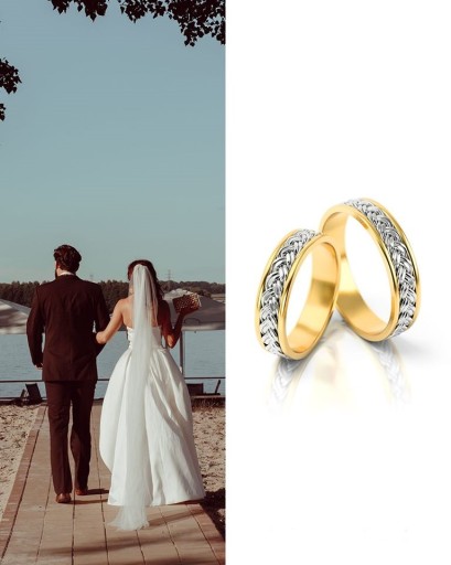 Ekskluzywne złote obrączki ślubne o wyjątkowym charakterze i stylistyce. Model urzeka niezwykłym ręcznie plecionym warkoczem.