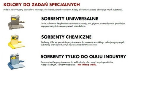 Sorbenty to skuteczne rozwiązanie w zakresie usuwania wycieków i rozlewów substancji niebezpiecznych. Przeznaczone są do stosowania zarówno wewnątrz jak i na zewnątrz pomieszczeń, do usuwania wycieków substancji niebezpiecznych, od płynów przemysłowych, przez produkty ropopochodne, aż po najbardziej agresywne chemikalia. Dostępność w postaci mat, rolek, poduszek i rękawów pozwala na odpowiedni dobór w zależności od zastosowania.