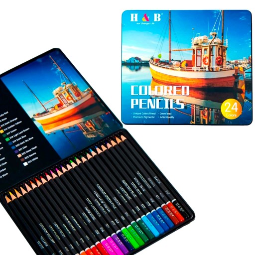 Zestaw zawiera 24 profesjonalnych kredek z rysikiem o średnicy 3mm. Wysokiej jakości odporne na złamania z dużą ilością pigmentu kredki dla małych i dużych artystów. Całość zapakowana w wygodne pudełko sprawia, że zestaw jest idealną pozycją na prezent dla bliskiej osoby.