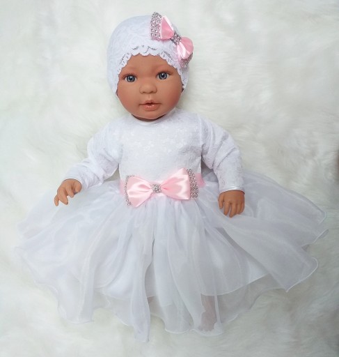 Sukieneczka góra sukienki wykonana jest z białej koronki na satynie, dół wykonany z satyny i organtyny, zapinana z tyłu na zameczek, zawiązywana szarfą ozdobioną kokardką