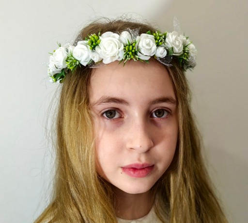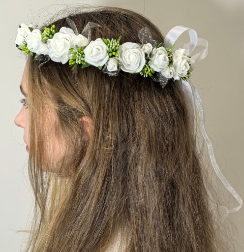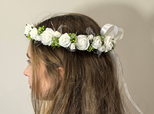 Wianek spleciony z różyczek piankowych, w tonacji bieli i zieleni.