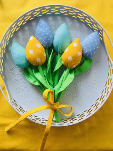 Materiał użyty do uszycia tulipana jest w 100% bawełniany, czyli naturalny, oddychający i miły w dotyku, a jego wnętrze wypełnione jest antyalergiczną kulką silikonową.