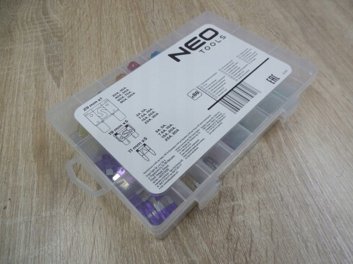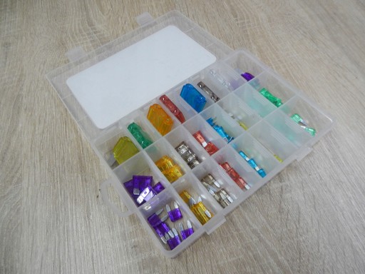 Zestaw bezpieczników samochodowych. Obudowa z poliwęglanu. W zestawie: szerokość 11 mm - 5 x 3A, 5 x 5A, 5 x 7.5A, 5 x 10A, 5 x 15A, 5 x 20A, 5 x 25A, 5 x 30Aszerokość 19 mm - 5 x 3A, 5 x 5A, 5 x 7.5A, 5 x 10A, 5 x 15A, 5 x 20A, 5 x 25A, 5 x 30Aszerokość 29 mm - 1 x 20A, 1 x 30A, 1 x 40A, 1 x 50A, 1 x 60A, 1 x 70A, 1 x 80A, 1 x 100A