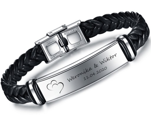 Spersonalizuj swoją bransoletkę umieszczając na blaszce ze stali chirurgicznej najważniejsze dla Ciebie informacje, takie jak: imiona dzieci, rocznicę ślubu, datę urodzin, wyznanie miłości... oraz wybierz jedną z niepowtarzalnych grafik i w ten sposób wyraź swoje uczucia. Można stworzyć bransoletkę, która naprawdę zatrzyma wspomnienia. Najwyższa jakość wykonania, skórzany pasek, stal 316L i te imiona! daty!