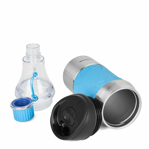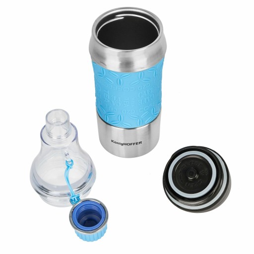 Pozostałe informacje: - kubek stalowy z antypoślizgową silikonową nakładką w kolorze niebieskim, - podwójna ścianka - izolacja próżniowa utrzymująca długo ciepło, - pokrywka standardowa z tworzywa sztucznego w kolorze czarnym, - pokrywka - butelka z tworzywa sztucznego transparentna z nakrętką w kolorze niebieskim, - obie pokrywki przeznaczone zarówno do napojów zimnych jak i ciepłych, - silikonowe uszczelki, - pojemność kubka standardowego: 350 ml, - pojemność kubka butelki: 500 ml, - średnica podstawy: 7 cm