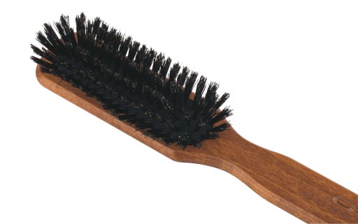 Średnia, owalna szczotka do włosów. Produkt został wykonany z naturalnego drewna i korka. Wyprofilowana rękojeść dopasowuje się do kształtu dłoni. Zapewnia wygodę oraz komfort podczas użytkowania. Powierzchnia czesząca posiada gęste, lekko elastyczne kępki szczeciny o różnej długości. Zostały wykonane z naturalnego włosia dzika, umieszczonego na czarnej, pneumatycznej poduszce. Pozwala na dokładne rozczesywanie krótkich włosów. Produkt wykonano z ogromną starannością i dbałością o detale, dzięki czemu pozwala na długoletnie użytkowanie. Na rękojeści umieszczono logo i nazwę producenta.