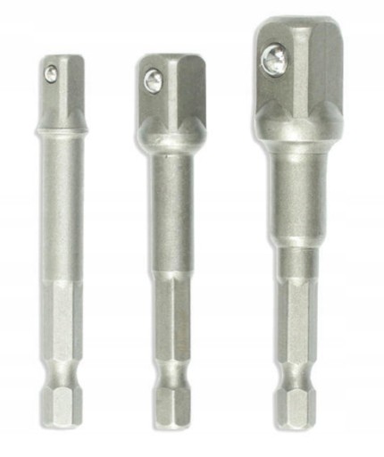 Zestaw 3 szt adapterów do nasadek o rozmiarze trzpienia 1/2", 1/4" oraz 3/8". Adaptery przystosowane są do pracy z wiertarko-wkrętarkami, wiertarkami oraz zakrętarkami. Adaptery wykonane z wytrzymałej stali chromowo wanadowej, która gwarantuje odpowiednią trwałość i odporność na korozje.