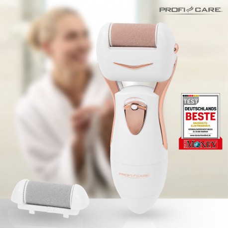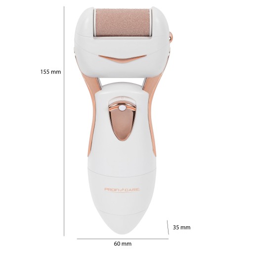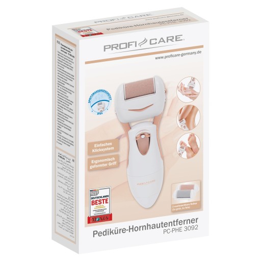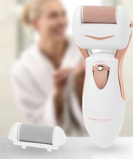 Proficare PC-PHE 3092 to wygodne urządzenie do pedicure. Dzięki niemu wygładzisz skórę stóp usuwając zrogowaciały naskórek. Dzięki dwóm wymiennym rolkom o większej i mniejszej grubości ziaren ściernych możesz pracować nią dwufazowo: wstępnie usunąć większe szorstkości, by później je wygładzić. Możesz go używać także do szorstkiej skóry łokci i dłoni. Ergonomiczny uchwyt i wodoszczelna obudowa.