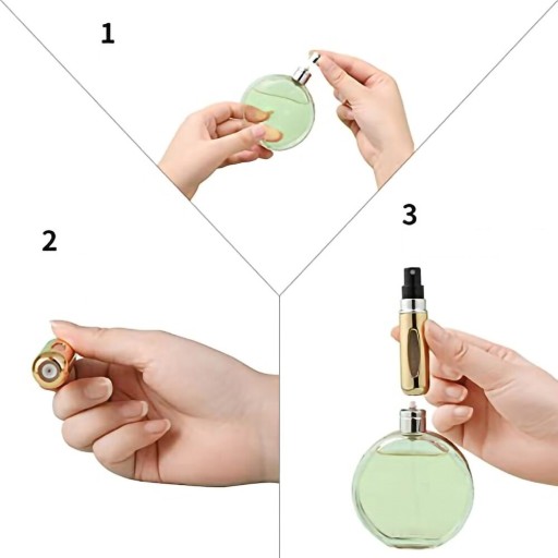 Łatwe napełnianie w kilka sekund - wystarczy nałożyć atomizer na dowolny flakonik perfum z odczepioną główką i kilkakrotnie napompować.
