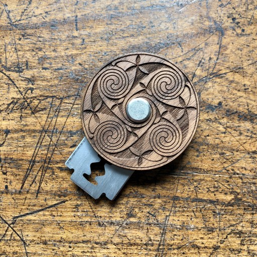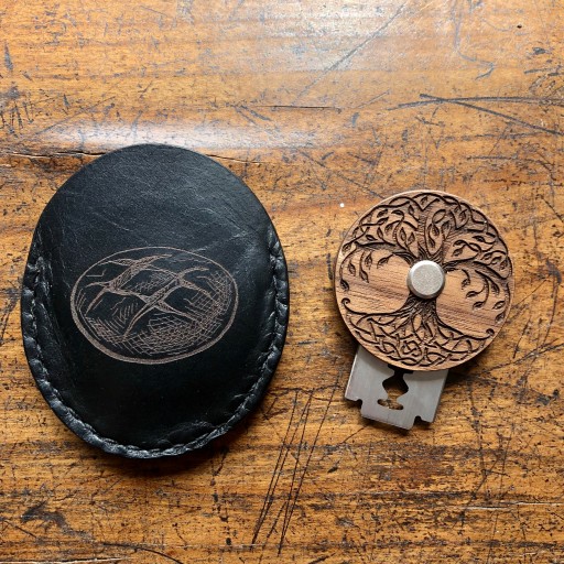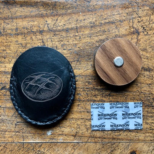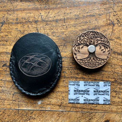 W skład zestawu wchodzi: drewniany uchwyt, śrubka mocująca, żyletka, skórzane etui i tekturowe pudełko.