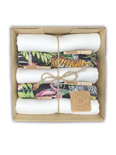 Komplet 5 sztuk najwyższej jakości pieluszek jest efektownie opakowany, gotowy do wręczenia jako prezent. W zestawie znajduje się również gratis w postaci firmowych klamerek.