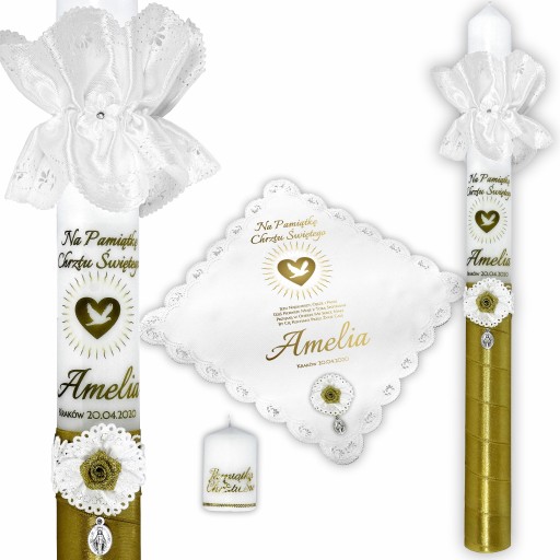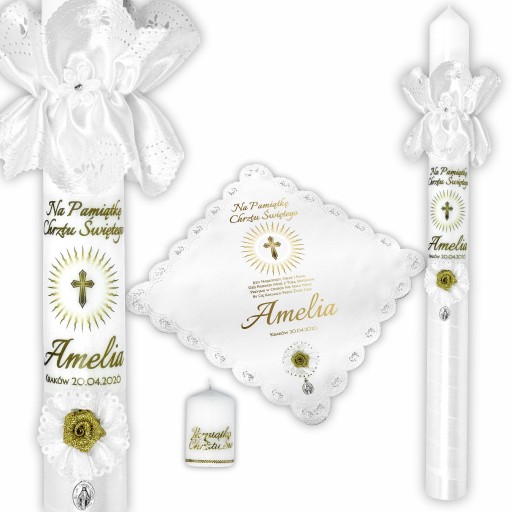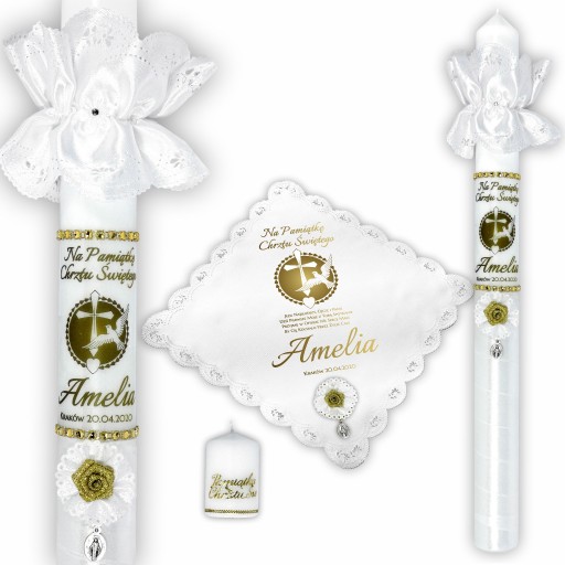 Świeca zarówno dla chłopców jak i dziewczynek, przyozdobiona białą satyną ze złotym akcentem, wykończona u dołu białym kwiatkiem. Zestaw podkreślony jest przez rozetę z piękną złotą różyczką, złote napisy z serduszkiem oraz profitkę.