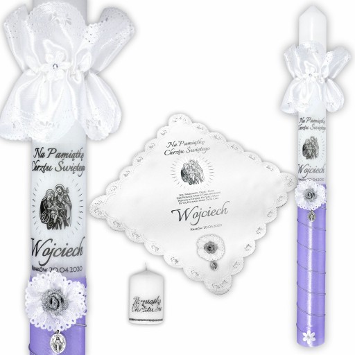 Bardzo delikatny zestaw. Świeca przyozdobiona fioletową satyną ze srebrnym akcentem, wykończona u dołu białym kwiatkiem. Głównym motywem jest srebrny obrazek Świętej Rodziny. Całość dopełnia srebrna, brokatowa różyczka
