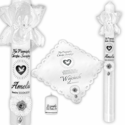 Bardzo delikatny i uniwersalny zestaw dla chłopców oraz dziewczynek. Delikatności świecy nadaje połączenie białej profitki i satyny wraz ze srebrną, brokatową różyczką oraz srebrne napisy. Całości dopełnia świetnie komponujący się medalik w kolorze srebra.