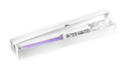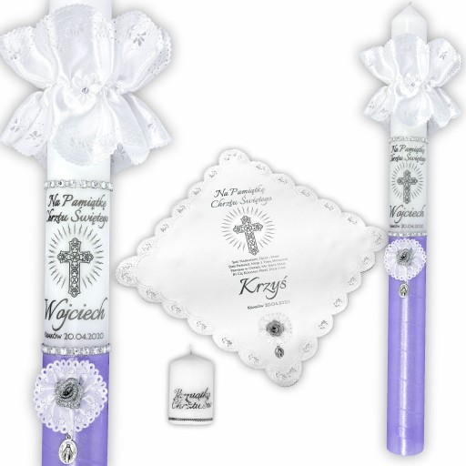 Świeca stylizowana fioletową satyną oraz dwoma pierścieniami z perełek znajdującymi się pomiędzy srebrnym obrazkiem krzyża otoczonego srebrnymi promieniami. Całość dopełniona piękną, brokatową różyczką w kolorze srebra oraz medalikiem.