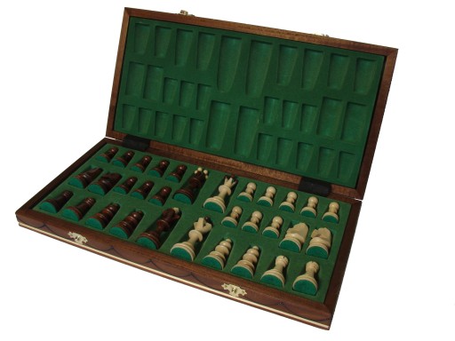 Wewnątrz kasety szachy poukładane są w specjalnie uformowanej wkładce, co nadaje im elegancji i zapobiega przemieszczaniu się figur.