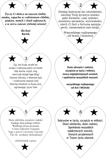 7 małych serduszek (można zmienić kształt) z krótkim tekstem