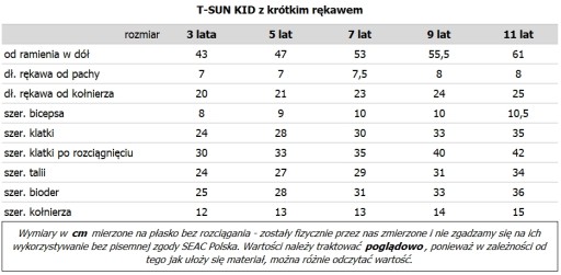 Odzież T-SUN wykonana jest w 100% z poliestru, bez dodatku spandexu, który jest odpowiedzialny za rozciągliwość materiału. Dlatego sugerujemy wybrać większy rozmiar niż wypada z pomiarów, aby była wygodniejsza w zakładaniu oraz użytkowaniu. Nie zalecamy wybierać rozmiaru "na styk".