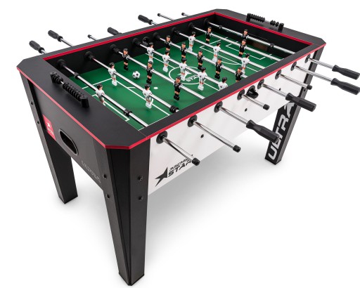 Stół do gry w piłkarzyki Ultra został wykonany z dbałością o szczegóły. Pole gry ma kolor zielony - taka neutralna powierzchnia nie rozprasza uwagi graczy i zapewnia pełną kontrolę nad torem piłki. Plastikowe figurki piłkarzyków zostały zamocowane na wytrzymałych stalowych prowadnicach. W zestawie znajdują się 3 piłki o średnicy 36 mm.