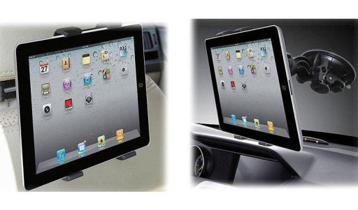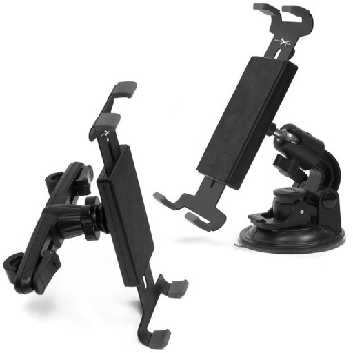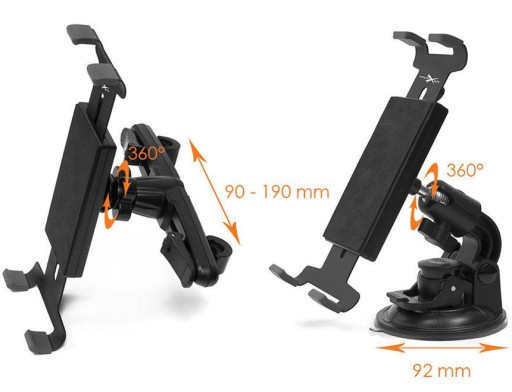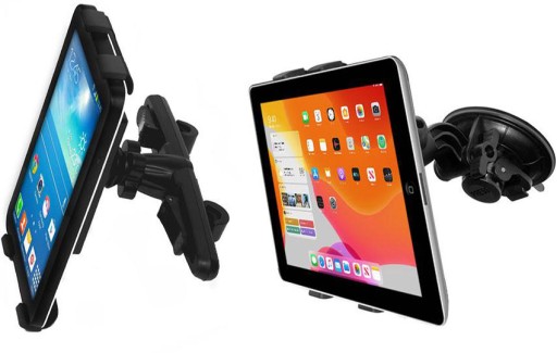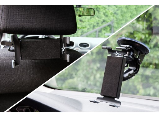 Zestaw dwóch uchwytów do tabletu, jeden mocowany na zagłówek fotela, a drugi z mocowaniem do szyby.
